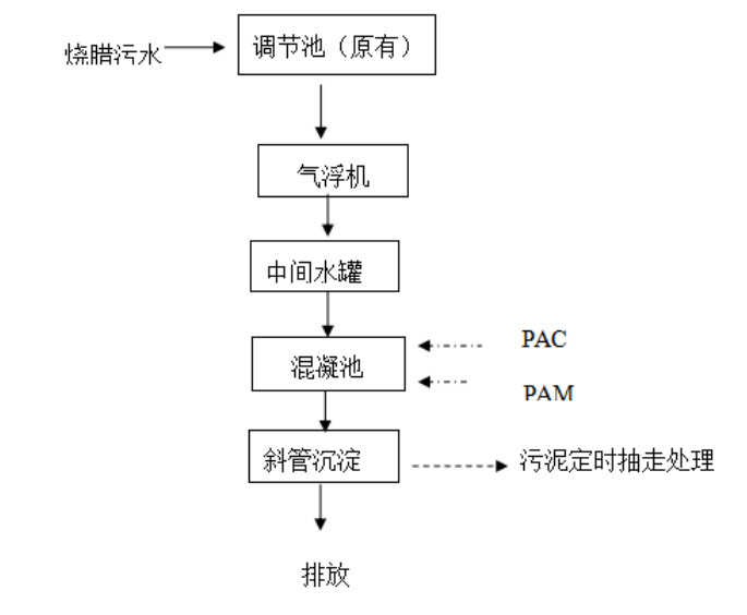 由于該項(xiàng)目的燒臘污水與屠宰污水所產(chǎn)生的地理位置原因,以及生產(chǎn)工藝和污水中的污染源不一,需新建另一套處理系統(tǒng)處理燒臘污水。燒臘廢水中主要含高濃度含油脂,COD不高,但如果不加以處理就直接排放,會(huì)對(duì)天然水體及自然環(huán)境中的微生物自凈能力產(chǎn)生抑制或阻止作用,使水質(zhì)不斷惡化,將會(huì)影響周圍的自然環(huán)境,進(jìn)一步危害我們?nèi)祟惖纳眢w健康。
